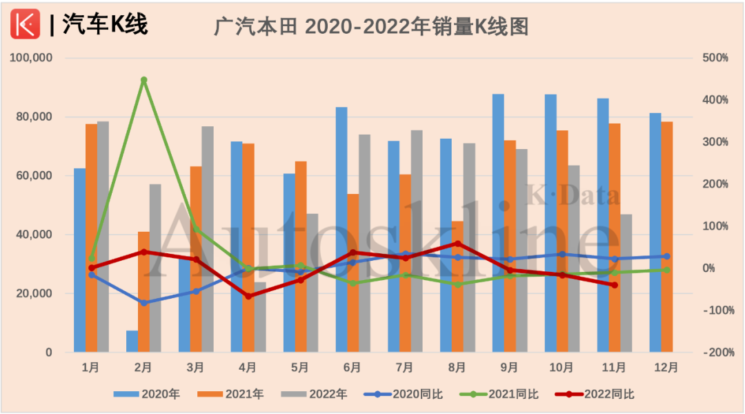 产销快报显示,广汽本田11月生产6.08万辆,同环比分别下降30.63%和21.04%,销量4.69万辆,同环比降幅更是扩大到了39.68%和26.27%。当然,这样的降幅与4月时高达66.35%同比跌幅相比要好得多,但同样是广汽本田近三年同期的最高同比降幅。