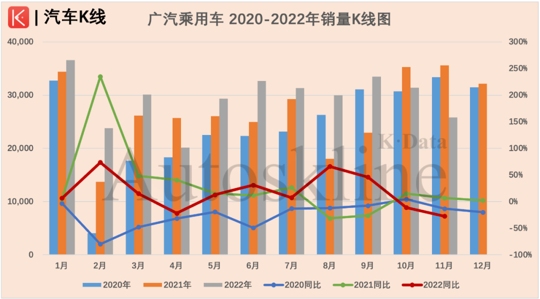 不过,从广汽集团自身来说,这已经是其连续第三个月出现增速下降的单月产销表现,单月销量同比由8月时的增长78.02%,逐月萎缩,并且在11月由正转负,单月同比下跌12.57%。