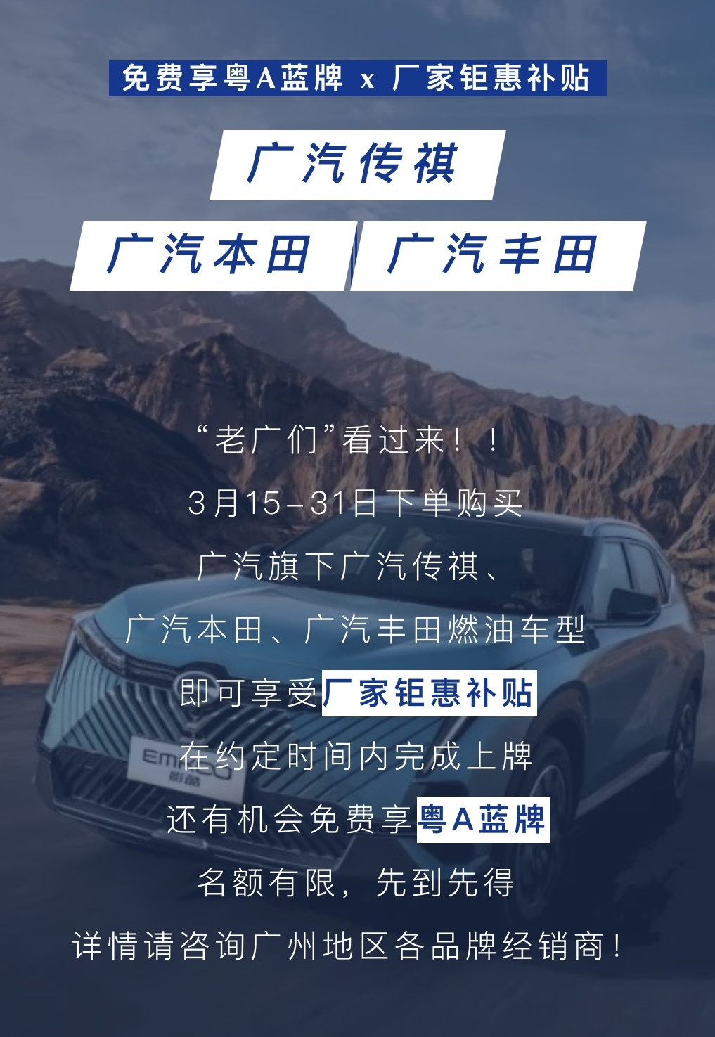 3月16日,广汽集团公众号发布消息称,消费者在3月15日~31日下单购买广汽集团旗下广汽传祺、广汽本田、广汽丰田燃油车型即可享受厂家提供的补贴,同时在约定时间内完成上牌,还有机会免费获得粤A蓝牌。