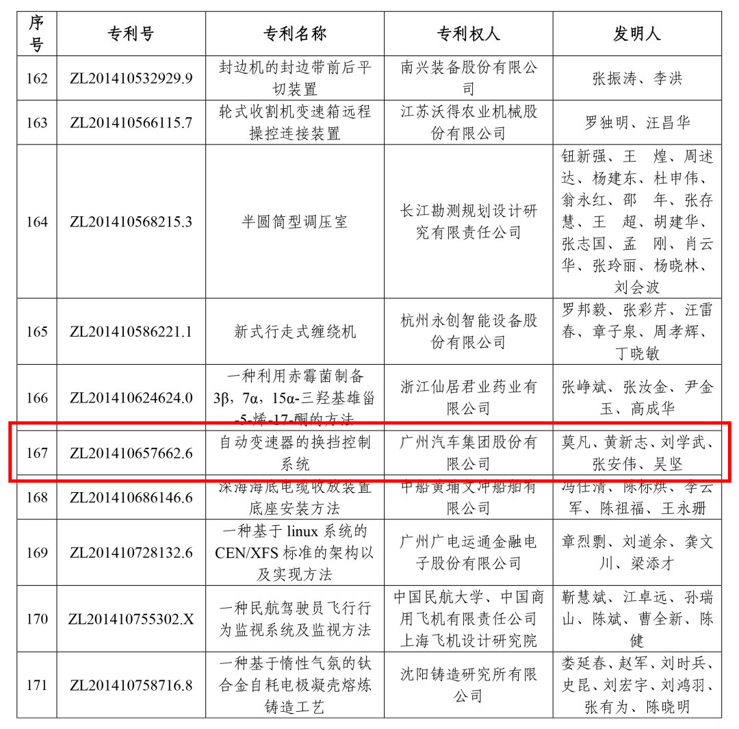 除中国外观设计金奖,广汽集团“自动变速器的换挡控制系统”发明专利还获得第二十四届中国专利优秀奖。