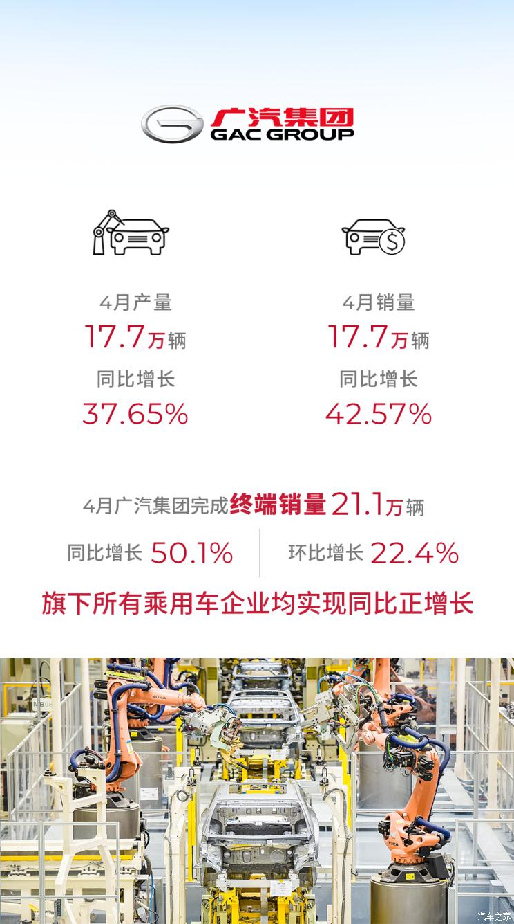 5月5日,广汽集团发布2023年4月产销快报,数据显示4月生产汽车17.7万辆、销售汽车17.7万辆,同比分别增长37.65%和42.57%。4月广汽集团完成终端销量21.1万辆,同比增长50.1%,环比增长22.4%,旗下所有乘用车企业均实现同比正增长。