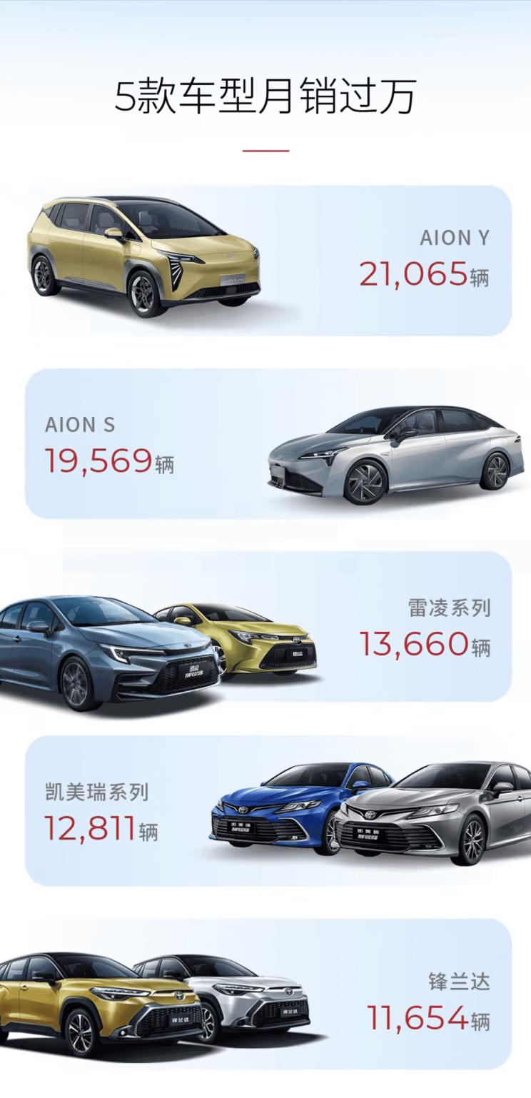 产品方面,4月广汽集团旗下5款车型销量过万,其中AION Y(参数|询价)销量21065辆,AION S销量19569辆,雷凌系列13660辆,凯美瑞系列12811辆,锋兰达销量11654辆。