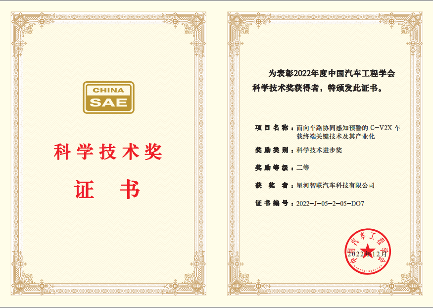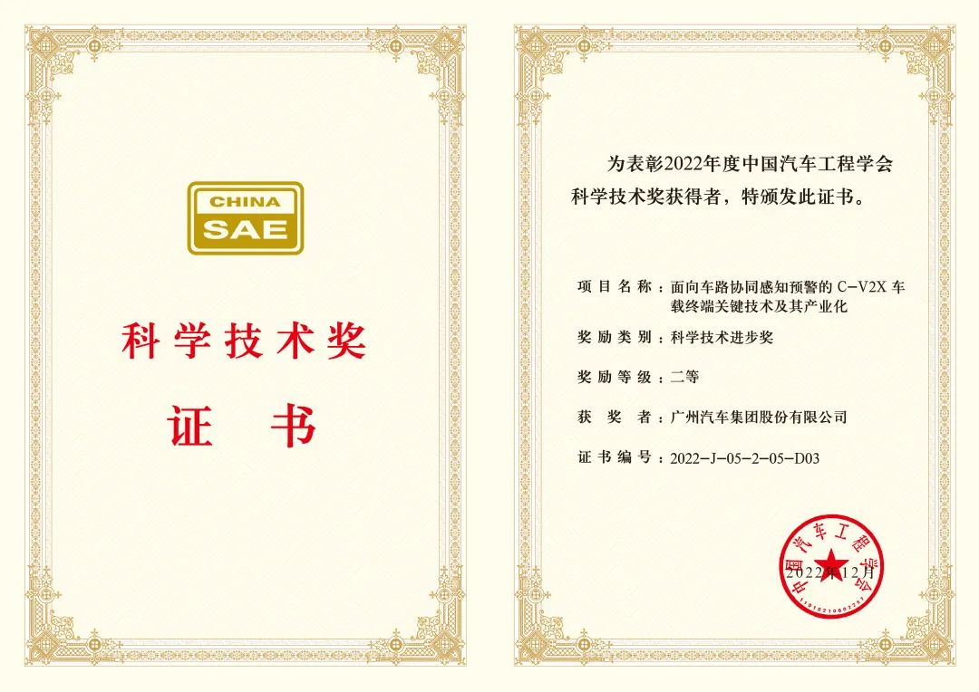 5月16日,中国汽车工程学会科学技术奖颁奖仪式在北京举行,广汽集团及星河智联凭借「面向车路协同感知预警的 C-V2X(Cellular Vehicle-to-Everything蜂窝车联网)车载终端关键技术及其产业化」项目,荣获中国汽车工程学会科学技术进步奖二等奖。