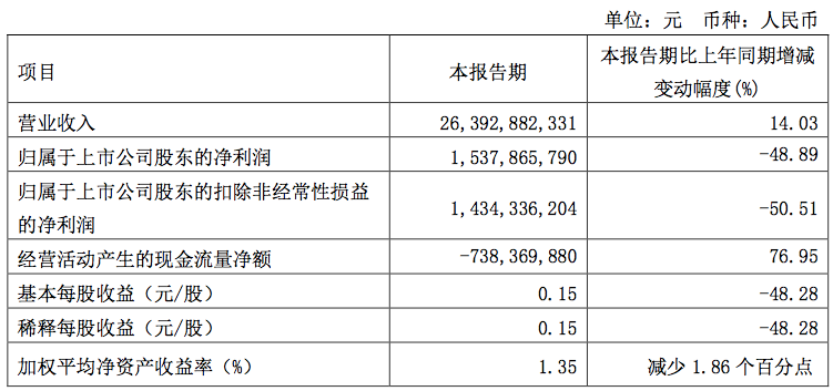 今年一季报,广汽集团销量为53.99万辆,同比下滑11.23%;营业收入为263.93亿元,同比增长14.03%;归母净利润为15.38亿元,同比下滑48.89%;扣非后净利润为14.34亿元,同比下滑50.51%。