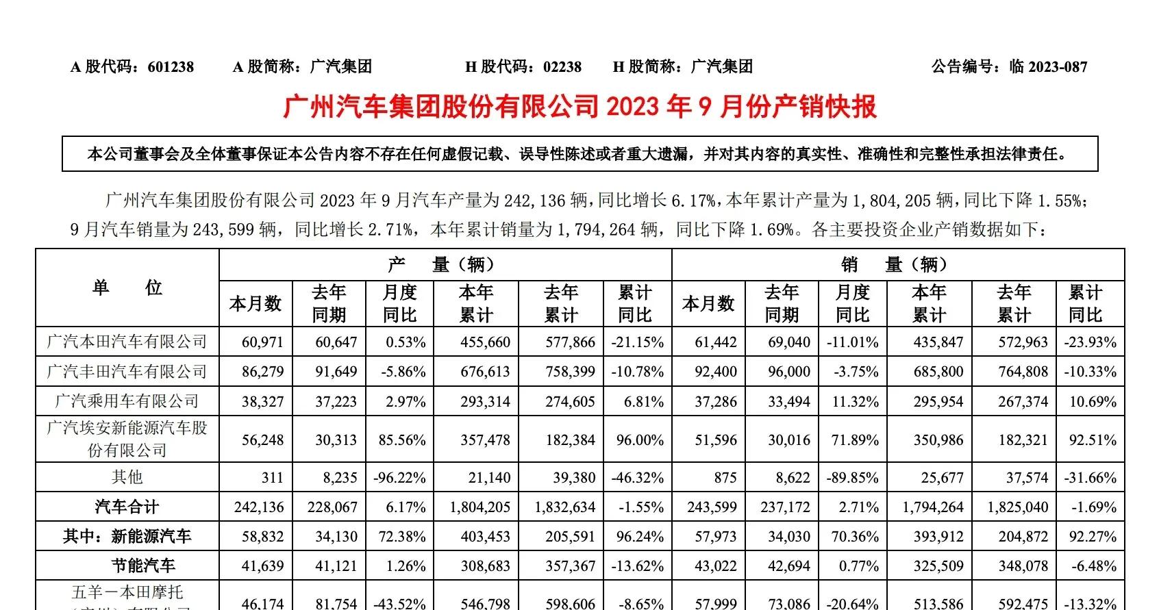 广汽集团公布了今年9月份产销数据,数据显示,广汽集团9月产销分别达到24.2万辆和24.3万辆,同比增长6.17%和2.71%。今年前三季度,广汽集团累计产销分别达到180.4万辆和179.4万辆,同比略有下降。其中,新能源车依然是广汽集团的亮点,9月产销量分别为5.88万辆和5.79万辆,同比增长均超过7成。