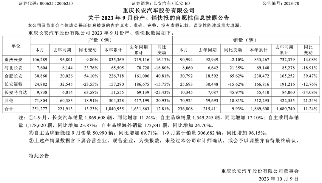 1-9月,长安汽车累计销售186.96万辆,同比增长11.24%,年度目标完成率66.77%。