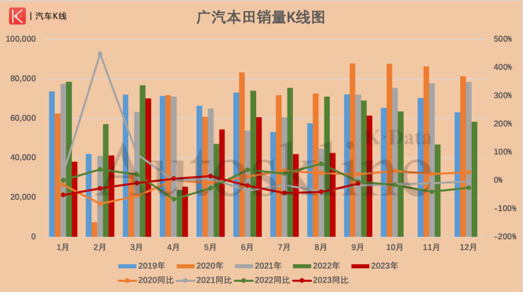 而回看2023年9月,在广汽丰田单月销量5连跌的同时,广汽本田单月销量也出现了连续4个月同比下跌的情况。