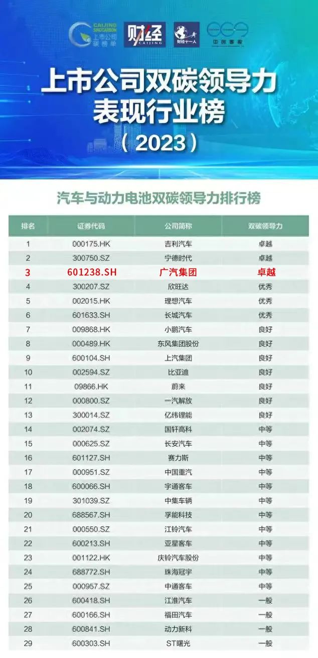 10月20日,《财经》杂志在北京举办第三届“碳中和高峰论坛”,并发布2023年度《中国上市公司碳排放排行榜暨双碳领导力榜》,广汽集团位列“汽车与动力电池双碳领导力”榜单第三名,获评为“卓越”企业,成为重视并践行双碳战略的企业典范。