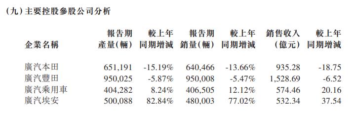 财报显示,2023年,广汽集团全年实现汽车产销量分别为252.88万辆和250.50万辆,同比分别增长1.97%和2.92%,产销规模位居国内汽车企业集团第五位,市场份额约8.32%。其中自主品牌销量近89万辆,产销量均创历史新高:广汽乘用车销量超40万辆;广汽埃安销量达48万辆,较上年同期增长77%,销量跻身国内新能源车前三。