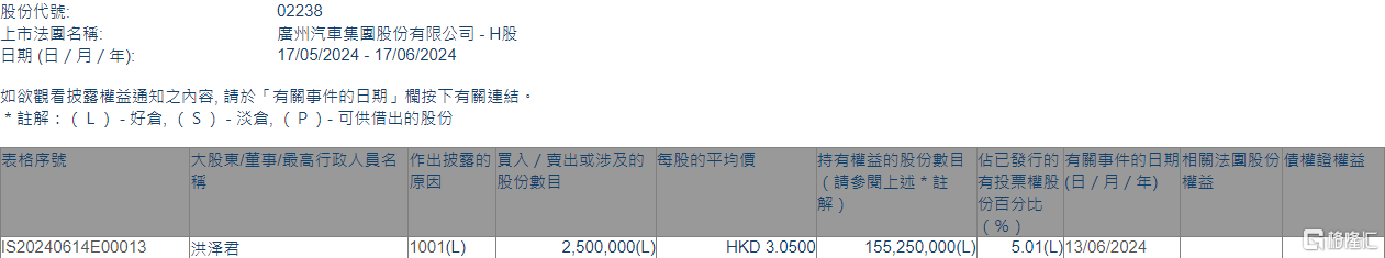 格隆汇6月17日丨根据联交所最新权益披露资料显示,2024年6月13日,广汽集团(02238.HK)获股东洪泽君在场内以每股均价3.05港元增持250万股,涉资约762.5万港元。