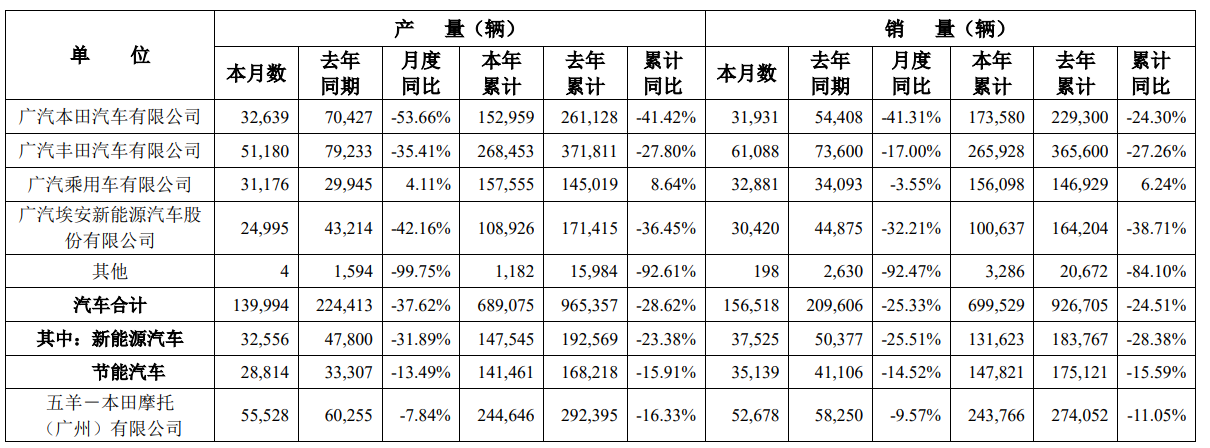 《电鳗财经》关注到,广汽集团近期发布的销量数据显示,2024 年 5 月汽车产量为 139,994 辆,同比下降 37.62%,本年累计产量为 689,075 辆,同比下降 28.62%;5 月汽车销量为 156,518 辆,同比下降 25.33%,本年累计销量为 699,529 辆,同比下降 24.51%。