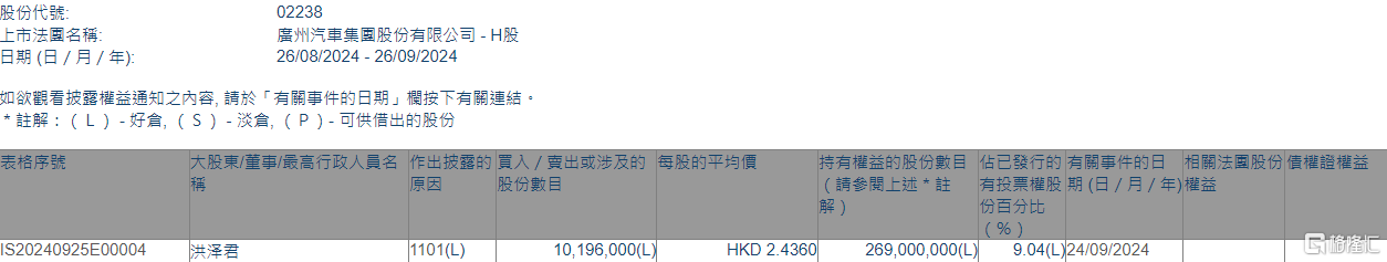 格隆汇9月26日丨根据联交所最新权益披露资料显示,2024年9月24日,广汽集团(02238.HK)获股东洪泽君在场内以每股均价2.436港元增持1019.6万股,涉资约2483.75万港元。