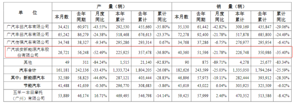 单月表现不佳,广汽埃安1-9月的累计销量也同比下滑35.4%至22.67万辆,在广汽集团各主要品牌中跌幅最大。