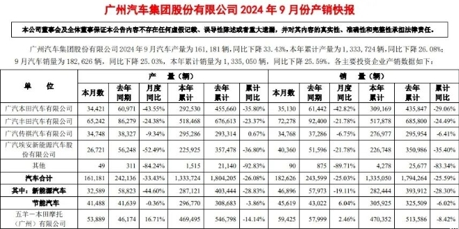 近日,广汽集团发布了2024年9月产销快报,数据显示其前9月累计销量为133.51万辆,同比下降25.59%。