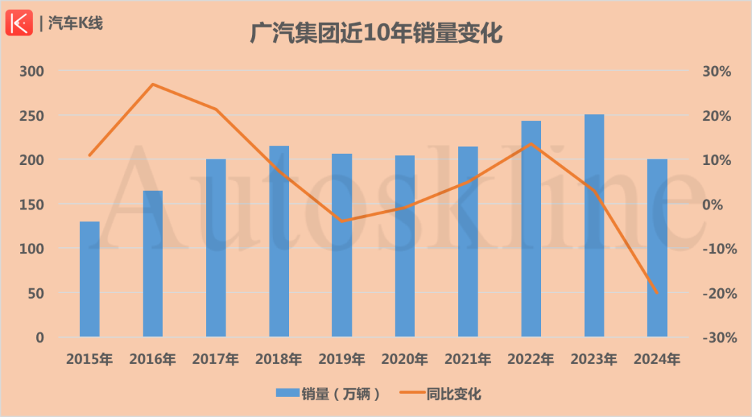 根据广汽集团披露的销量显示,2024年其累计销量为200.31万辆,同比下滑20.04%,仅完成去年销量目标275.55万辆的72.69%。