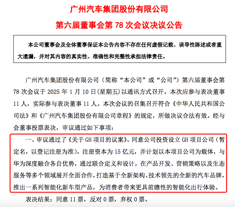 1月10日,广汽集团审议通过《关于GH项目的议案》,同意公司投资设立GH项目(暂定名),注册资本为15亿元,并计划以其为载体,与华为深度融合各自优势,通过联合定义和设计,在产品开发、营销策略以及生态服务等多个领域展开全面合作,打造基于全新架构、技术领先的全新汽车品牌,推出一系列智能化新车型。