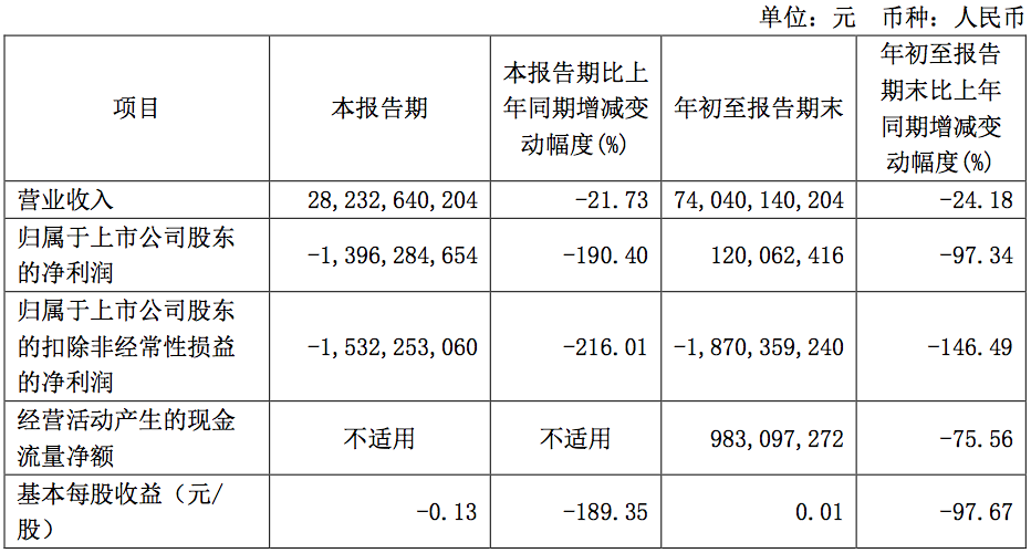 其中,2024年第三季度,该公司营业收入为282.33亿元,同比下滑21.73%;归母净利润为亏损13.96亿元,同比下滑190.4%;扣非净利润为亏损15.32亿元,同比下滑216.01%。