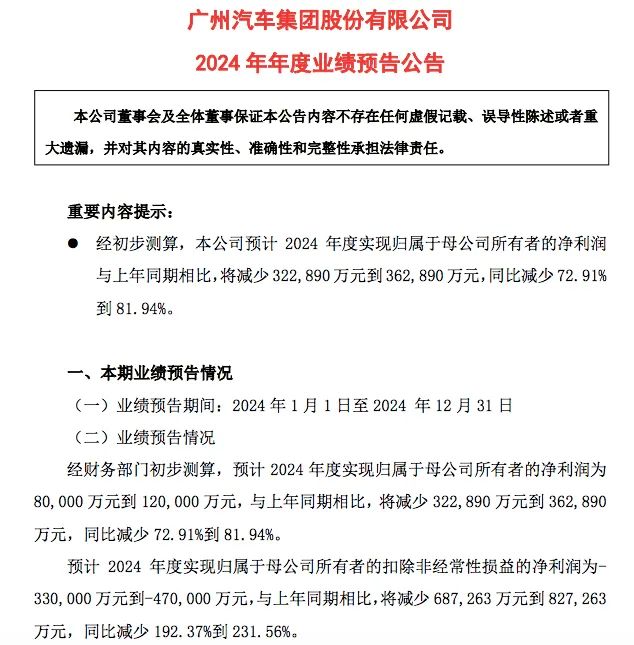 1月10日,广汽集团披露2024业绩预告预计,2024年度归母净利润为8亿~12亿元,与上年同期相比,将减少32.29亿~36.29亿元,同比减少72.91%~81.94%。其扣非净利润直接由盈转亏,为亏损3.3亿~4.7亿元,与上年同期相比,将减少68.73亿~82.73亿元,同比减少192.37%~231.56%。