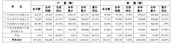 广汽集团的主要销量来源于广汽本田和广汽丰田两大日系合资品牌。但2024年以来,随着国内汽车行业竞争日趋激烈,广汽集团旗下的合资品牌销量遇冷。数据显示,2024年广汽本田销量47.06万辆,同比下滑26.52%;广汽丰田销量73.8万辆,同比下滑22.32%,两大合资品牌均呈两位数下降趋势。
