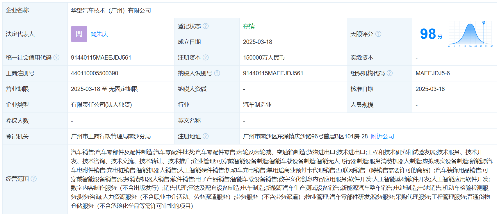 记者获悉,3月18日,华望汽车技术(广州)有限公司正式注册成立,注册资本为15亿元人民币,法人代表为閤先庆,经营范围包括汽车销售、汽车零部件及配件制造、新能源汽车生产测试设备销售以及新能源汽车整车销售等。