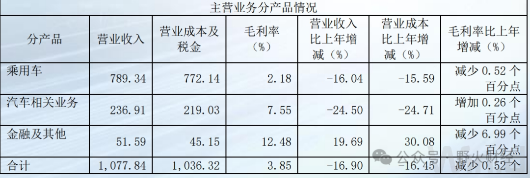 按照产品分类,乘用车完成收入789亿元,减少16%,汽车相关业务收入237亿元,减少24.5%;只有金融及其他业务增长大约两成,至51.6亿元。