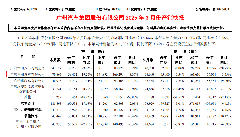相比之下,广汽丰田的表现格外亮眼。3月销量为68,600辆,同比增长5.54%;本年累计销量为161,600辆,同比增长3.55%。在广汽集团整体销量下滑的背景下,广汽丰田的正增长显得尤为突出。