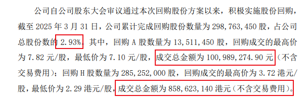 4月8日,广汽集团发布公告称,自股东大会审议通过股份回购方案后,截至3月31日,合计回购A+H股2.99亿股,占上市公司总股份的2.93%,共花费9.14亿元。