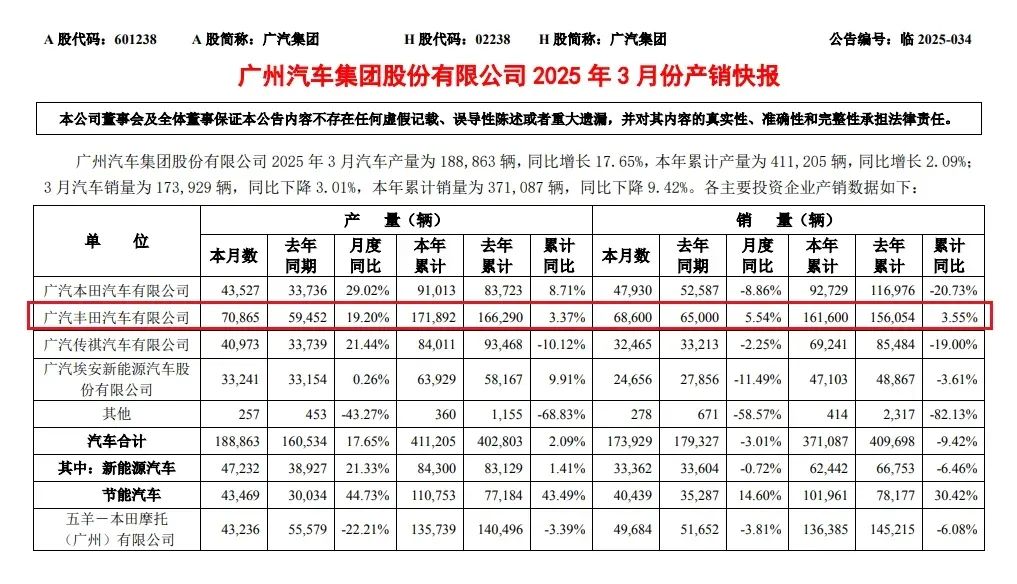 广汽集团3月销量:四大品牌仅广汽丰田正增长