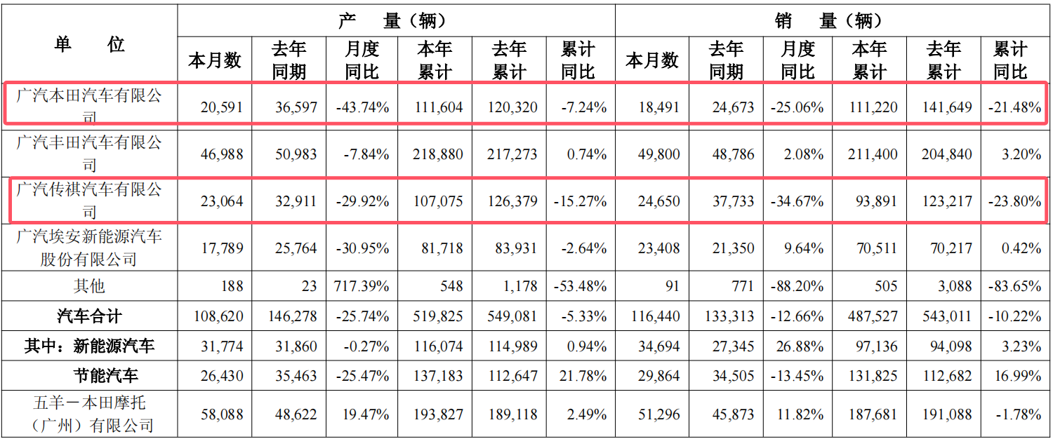 广汽传祺汽车有限公司 4 月产量为 23,064 辆,同比下降 29.92%;本年累计产量为 107,075 辆,同比下降 15.27%。4 月销量为 24,650 辆,同比下降 34.67%;本年累计销量为 93,891 辆,同比下降 23.8%。