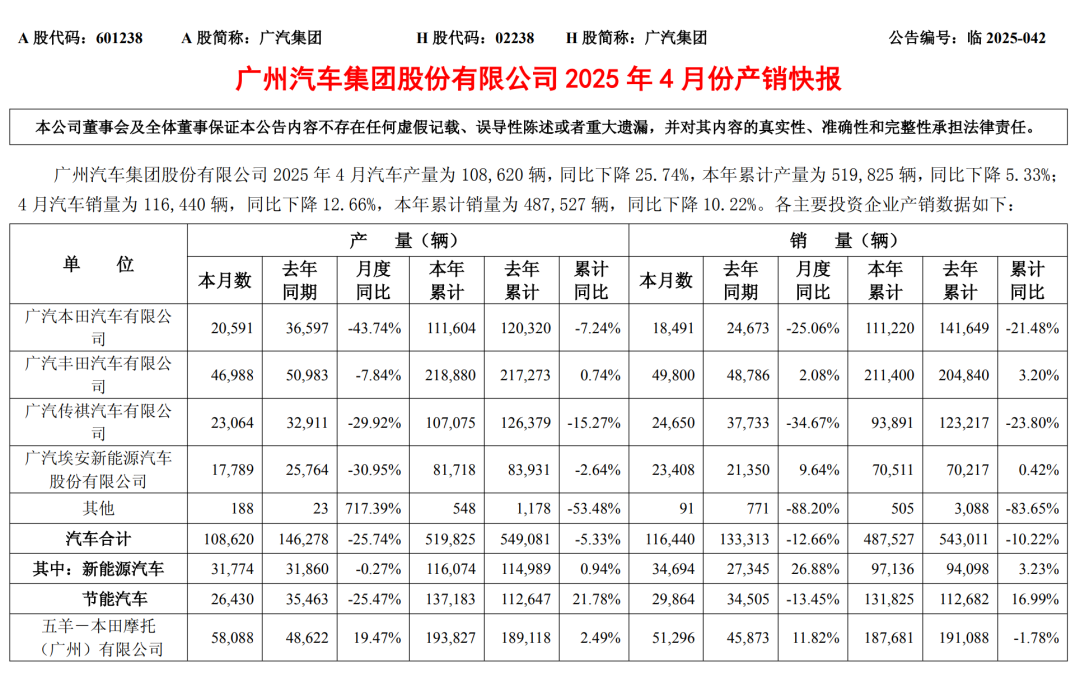 5月10日,广汽集团发布4月销量成绩单。数据显示,2025年4月广汽集团销量11.64万辆,同比下滑12.66%,其中新能源汽车销量3.47万辆,同比增长26.88%;2025年1-4月广汽集团销量为48.75万辆,同比下滑10.22%,其中新能源汽车销量9.71万辆,同比增长3.23%。