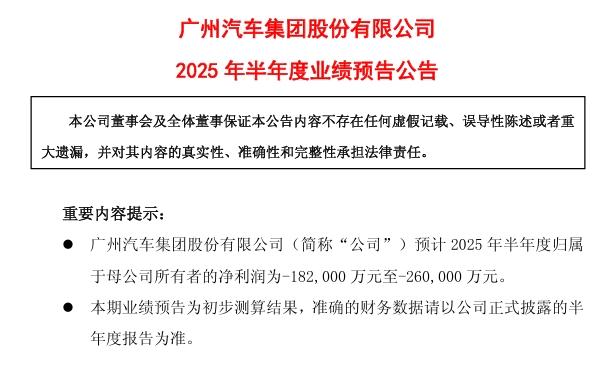 近日,广汽集团发布了2025年上半年业绩预告,预计归母净亏损18.2亿元至26亿元,预计扣非净亏损21.2亿元至32亿元,与2024年同期盈利15.16亿元形成鲜明对比,跌幅超220%。