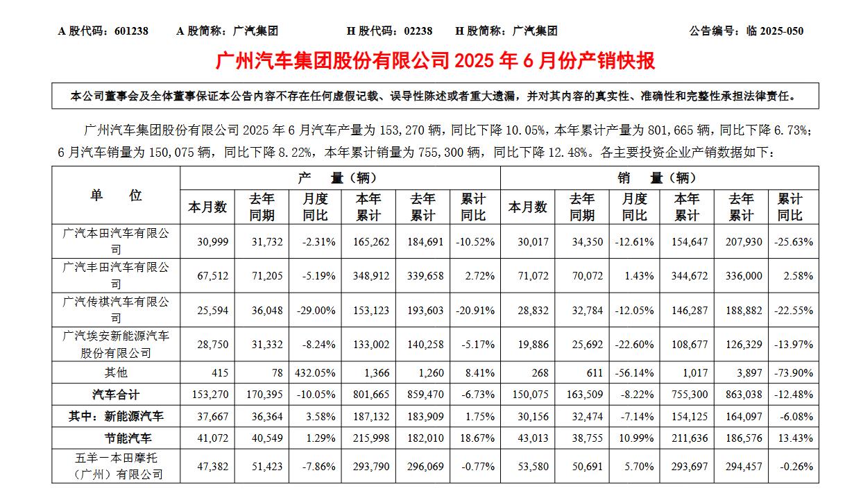 广汽集团业绩断崖式下滑的直接原因在于销量上的失速,产销快报显示,上半年广汽集团累计销量75.53万辆,同比下降12.48%,其中仅广汽丰田实现2.58%的微增,广汽本田、广汽传祺、广汽埃安等品牌销量全线下滑,新能源汽车板块整体下降6.08%。更严峻的是,二季度亏损环比扩大至10.88亿元至18.68亿元,同比亏损幅度加剧。