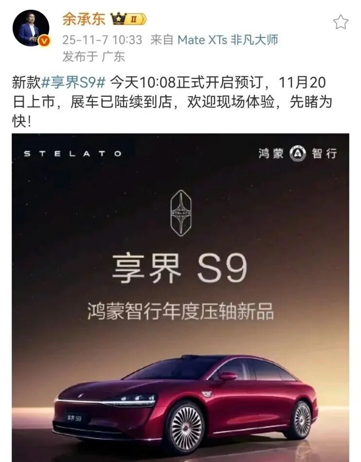 华为余承东正式官宣:新款享界 S9 预订开启,预售价 31.8 万起。