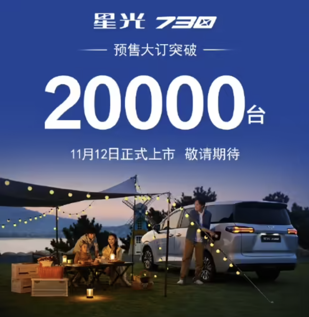 五菱汽车宣布,星光 730 累计预售大订突破 20000 台,将于 11 月 12 日正式上市。