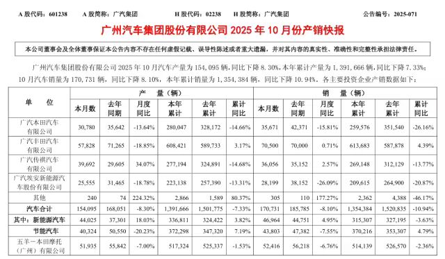 广汽集团今日发布 2025 年 10 月产销快报,10 月汽车销量 170,731 辆,同比下降 8.10%;本年累计销量为 1,354,384 辆,同比下降 10.94%。