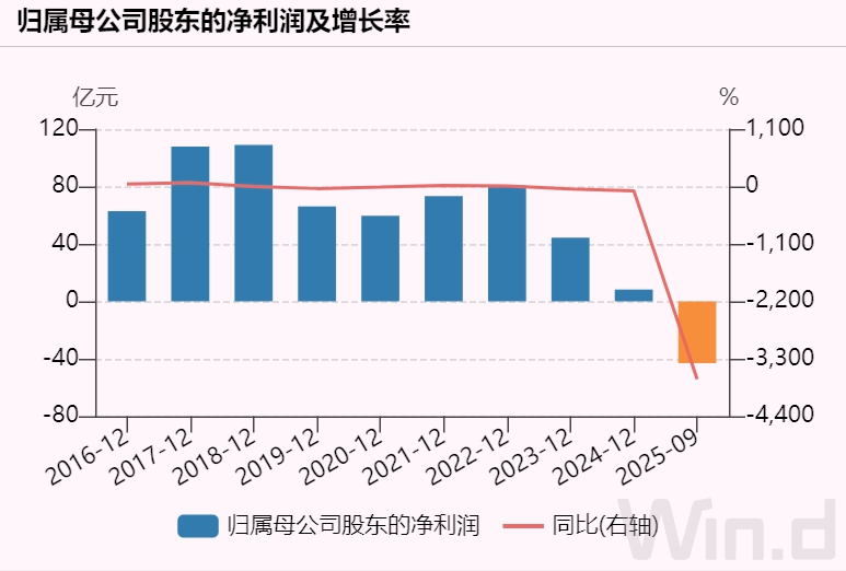 其次,亏损金额实在惊人。根据万得,2025年前三季度,广汽集团“双降”,实现收入669亿元,减少10.5%,净亏损超过43亿元,从一季度到三季度都在亏损中。