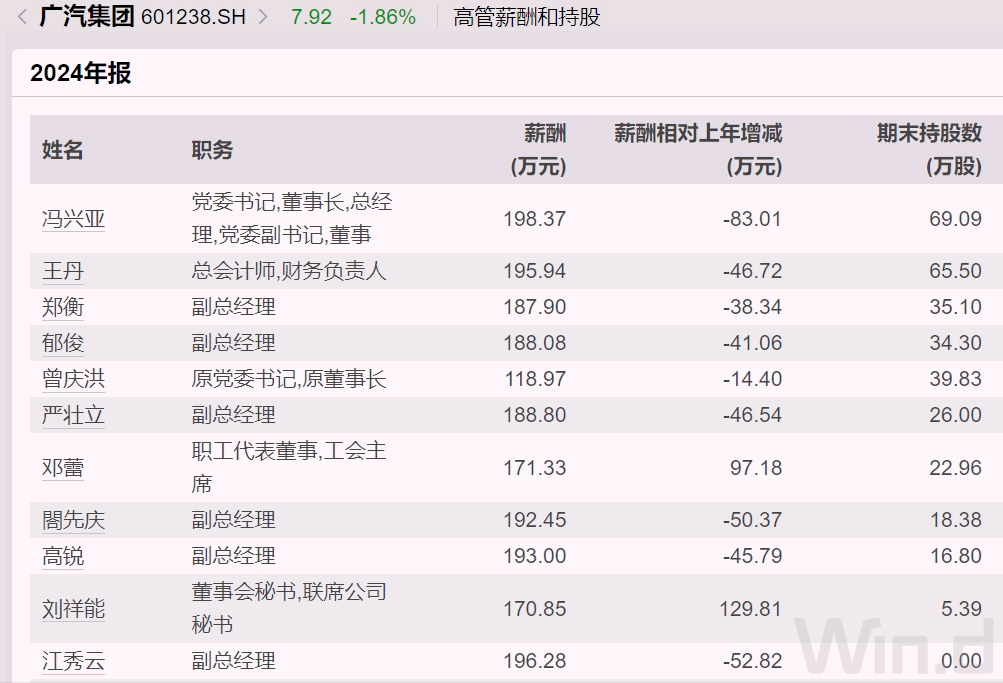 笔者注意到,2024年净利润大幅下滑,广汽集团管理层也相应降薪,幅度也不低;比如原总经理现任董事长冯兴亚降薪83万元,还剩下198万元;原董事长曾庆洪也降薪14万元。