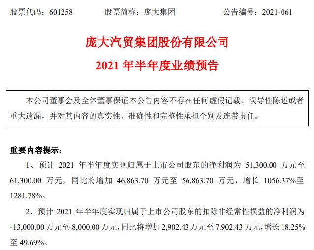 今日,庞大集团(601258.SH)披露了2021年半年度业绩预告。经财务部门初步测算,预计2021年半年度实现归属于上市公司股东的净利润为5.13亿元至6.13亿元,同比将增加4.69亿元至5.69亿元,增长1056.37%至1281.78%。预计2021年半年度实现归属于上市公司股东的扣除非经常性损益的净利润为-1.30亿元至-8000.00万元,同比将增加2902.43万元至7902.43万元,增长18.25%至49.69%。