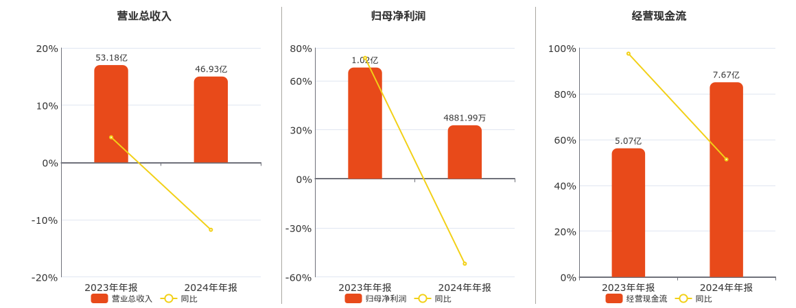 公司营业总收入为46.93亿元,较去年同报告期营业总收入减少6.26亿元,同比较去年同期下降11.76%。归母净利润为4881.99万元,较去年同报告期归母净利润减少5268.10万元,同比较去年同期下降51.90%。经营活动现金净流入为7.67亿元。