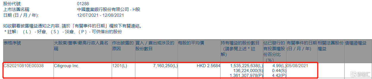格隆汇APP获悉,根据联交所最新权益披露资料显示,2021年8月5日,农业银行(01288.HK)遭Citigroup Inc.在场内以每股均价2.5684港元减持好仓716.025万股,涉资约1839.04万港元。