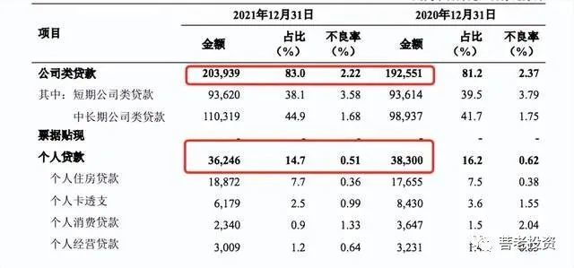 2021年末不良贷款余额2,457.82亿元,较上年末增加86.69亿元,增加的比例只有3.66%,但是总贷款的增加了2万亿元,增幅高达13.16%,也就是说贷款的增幅远远超过了不良的增幅,而且农行主要的不良贷款其实都是来自公司贷款的: