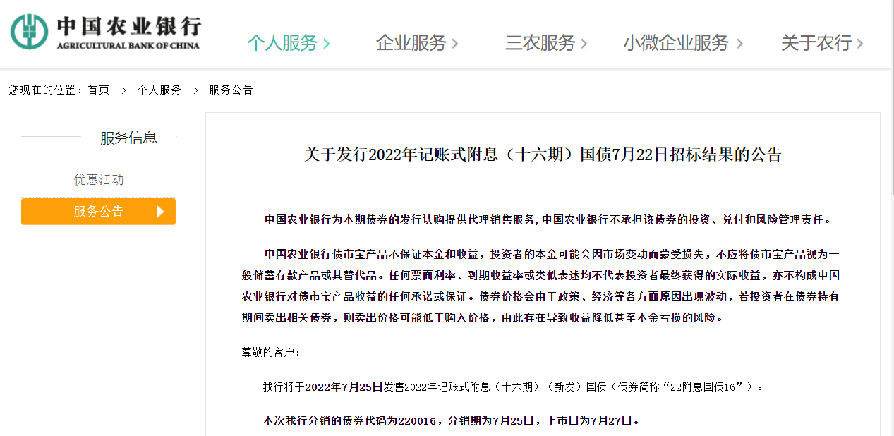 公告称,我行将于2022年7月25日发售2022年记账式附息(十六期)(新发)国债(债券简称“22附息国债16”)。