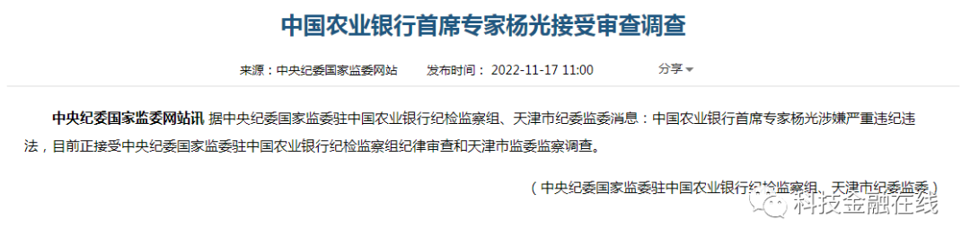 据中央纪委国家监委驻中国农业银行纪检监察组、天津市纪委监委消息:中国农业银行首席专家杨光涉嫌严重违纪违法,目前正接受中央纪委国家监委驻中国农业银行纪检监察组纪律审查和天津市监委监察调查。