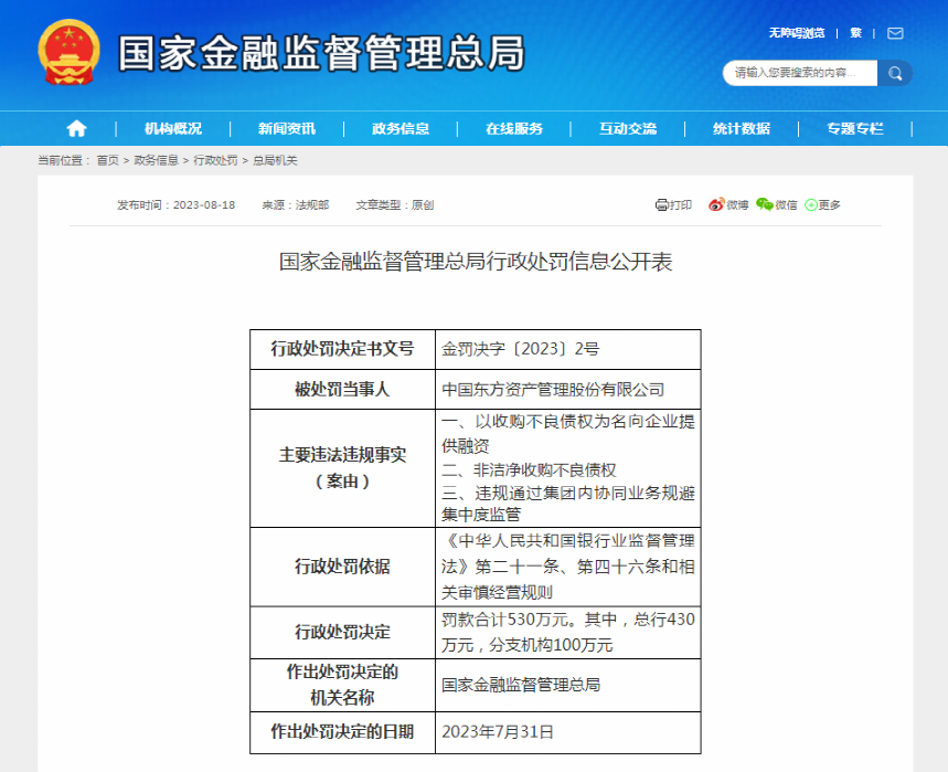 行政处罚信息公开表显示,中国东方资产管理股份有限公司因违反《中华人民共和国银行业监督管理法》第二十一条、第四十六条和相关审慎经营规则,被国家金融监督管理总局罚款合计530万元。其中,总行430万元,分支机构100万元。