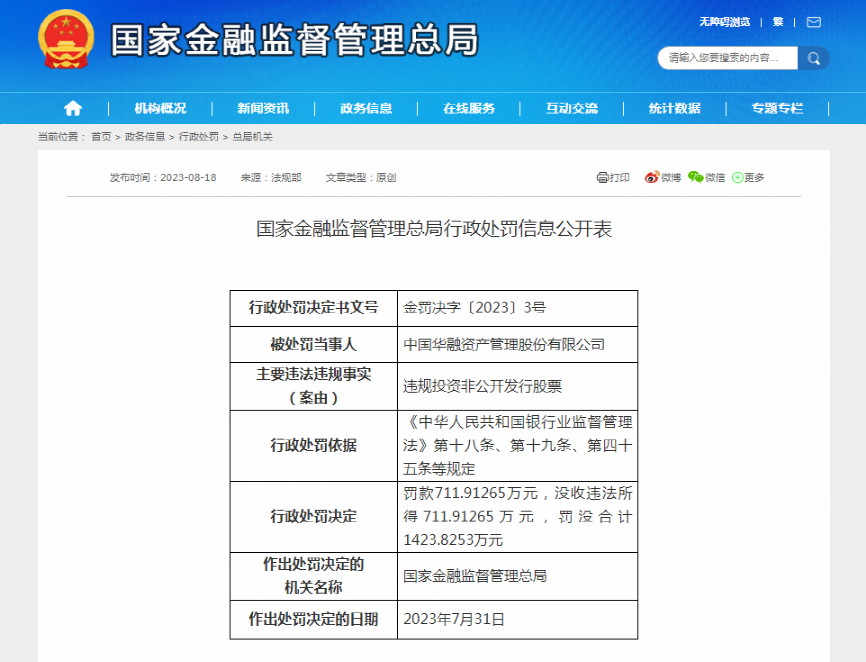 行政处罚信息公开表显示,中国华融资产管理股份有限公司因违规投资非公开发行股票,违反了《中华人民共和国银行业监督管理法》第十八条、第十九条、第四十五条等规定;被国家金融监督管理总局罚款711.91万元,没收违法所得711.91万元,罚没合计1423.83万元。