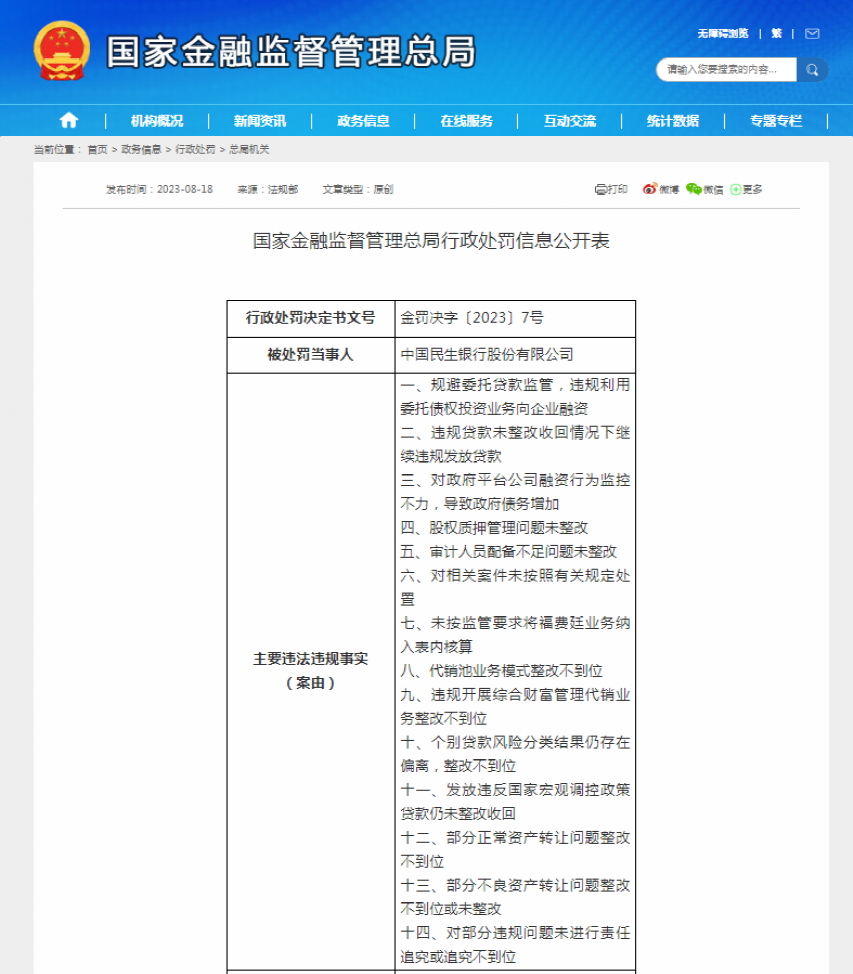 8月18日,国家金融监督管理总局官网发布数条行政处罚信息。民生银行、农业银行、广发银行、中国华融、东方资产均因违反相关规定,被开具大额罚单,合计罚超1.3亿元。