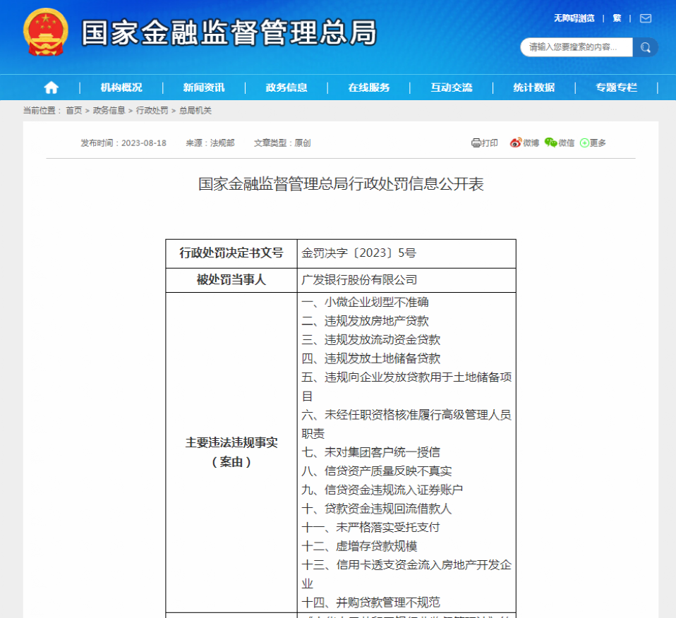 行政处罚信息公开表显示,广发银行因违反《中华人民共和国银行业监督管理法》第二十条、第二十一条、第四十六条和相关审慎经营规则,被国家金融监督管理总局罚款合计2340万元。其中,总行550万元,分支机构1790万元。