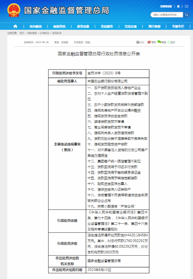 行政处罚信息公开表显示,中国农业银行股份因违反《中华人民共和国商业银行法》第四十条、第七十四条,《中华人民共和国银行业监督管理法》第二十一条、第四十六条及相关审慎经营规则,被国家金融监督管理总局没收违法所得并处罚款合计4420.18万元。其中,对总行罚款1760.09万元,没收违法所得60.09万元,对分支机构罚款2600万元。