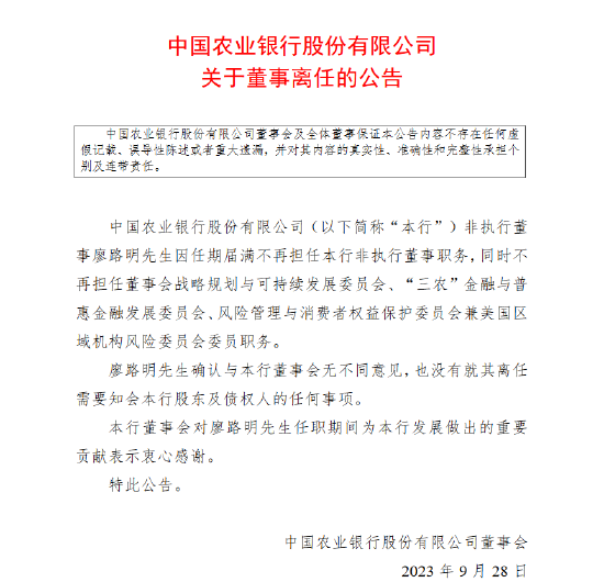 10月8日金融一线消息,农行发布关于董事离任的公告。公告称,中国农业银行股份有限公司非执行董事廖路明先生因任期届满不再担任农业银行非执行董事职务,同时不再担任董事会战略规划与可持续发展委员会、“三农”金融与普惠金融发展委员会、风险管理与消费者权益保护委员会兼美国区域机构风险委员会委员职务。