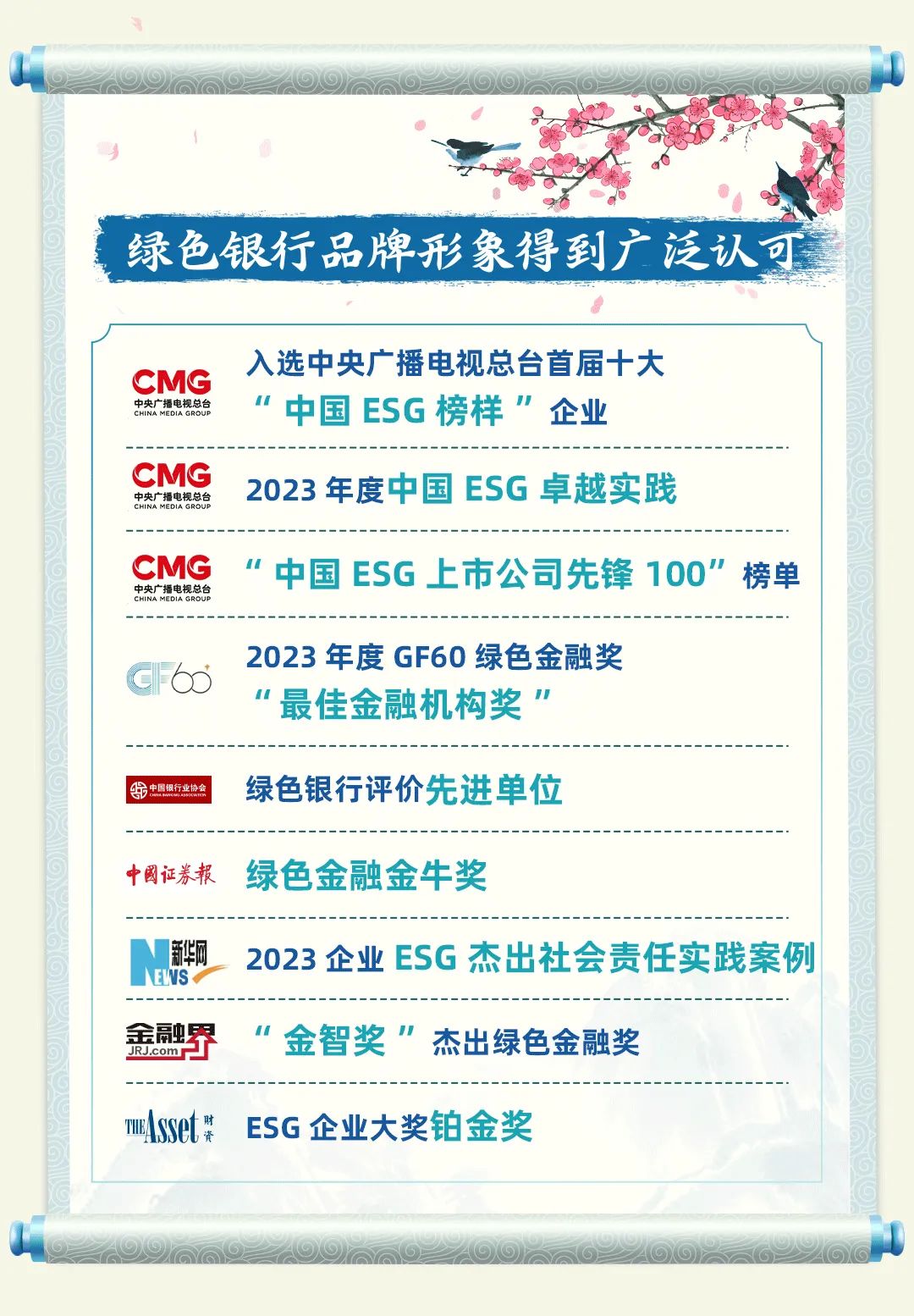 牢固树立和践行绿水青山就是金山银山的理念,推动将环境、社会和治理(ESG)工作纳入公司章程,深入推进绿色金融战略。充分发挥董事会战略规划与可持续发展委员会、高管层绿色金融/碳达峰碳中和工作委员会作用,完善ESG治理架构,持续做好顶层设计和组织推动。积极践行国内外ESG和绿色金融标准,把绿色发展理念融入经营管理全过程、各领域,在做大绿色投融资规模的同时,推动自身运营节能降碳,绿色银行品牌形象得到广泛认可。2023年,农业银行被中央广播电视总台联合国务院国资委、全国工商联、中国社科院、中国企业改革与发展研究会等权威机构评选为首届十大“中国ESG榜样”企业,获评中国银行业协会“绿色银行评价先进单位”。